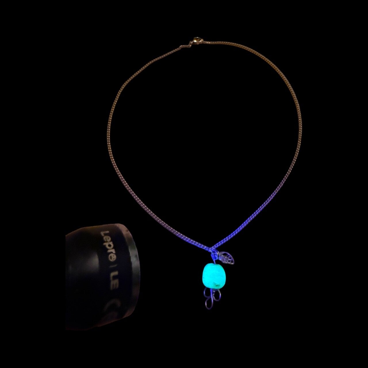 Now repurposed as a pendant, it carries with it a luminous piece of Victorian decorative history — one that quite literally lights up under the right conditions.